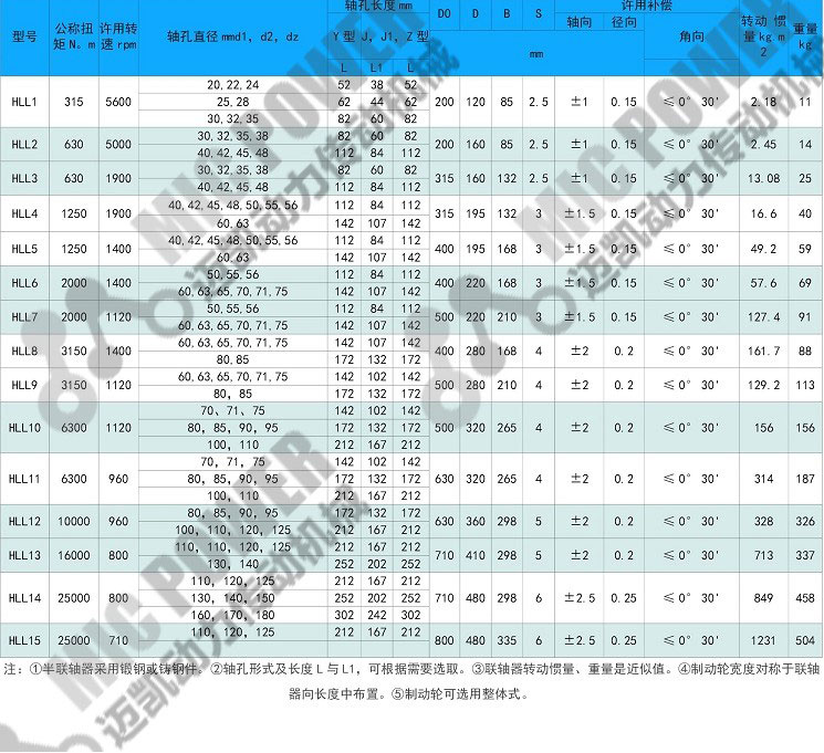HLL型帶制動輪彈性柱銷聯(lián)軸器,制動輪柱銷聯(lián)軸器,LXZ型(原HLL型)-彈性柱銷聯(lián)軸器(GB5014-2003)   本聯(lián)軸器已列為標準GB5014-85,適用于各種機械聯(lián)接兩同軸線的傳動軸,通常用于動頻繁的高低速運動。工作溫度為-20 ~+80℃;傳遞公稱扭矩為40~20000N.m。 軸孔型式有圓柱形(Y)、圓錐形(Z)和短圓柱形(J)。軸孔和鍵槽按標準GB3852-83《聯(lián)軸器軸柱和鍵槽形式及尺寸》的規(guī)定加工。半聯(lián)軸器采用精密鑄造,鑄鐵HT20-40、鑄鋼ZG35Ⅱ,軸孔和鍵槽采用拉制成型,柱銷采用MC尼龍b制成。http://www.btmcjx.com 彈性柱銷聯(lián)軸器具有較大結(jié)構(gòu)簡單、合理,維修方便、兩面對稱可互換,壽命長,允許較大的軸向竄動,具有緩沖、減震、耐磨等性能。 彈性柱銷聯(lián)軸器是利用若干非金屬彈性材料制成的柱銷,置于兩半聯(lián)軸器凸緣孔中,通過柱銷實現(xiàn)兩半聯(lián)軸器聯(lián)接,該聯(lián)軸器結(jié)構(gòu)簡單,容易制造,裝拆更換彈性元件比較方便,不用移動兩半聯(lián)軸器。彈性元件(柱銷)的材料一般選用尼龍,有微量補償兩軸線偏移能力,彈性件工作時受剪切,工作可靠性,僅適用于要求很低的中速傳動軸系,不適用于工作可靠性要求較高的工況. LXZ型(原HLL型)-彈性柱銷聯(lián)軸器基本參數(shù)和主要尺寸:規(guī)格:HLL1-15,公稱轉(zhuǎn)矩315-25000,許用轉(zhuǎn)速5600-710,軸孔直徑20-180,軸孔長度38-302,重量11-504,材質(zhì):鑄鐵,鑄鋼,精鋳。